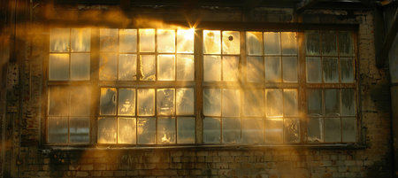 Golden Hour Sunlight Streaming Through Old Factory Windows, Illuminating Dust Particles