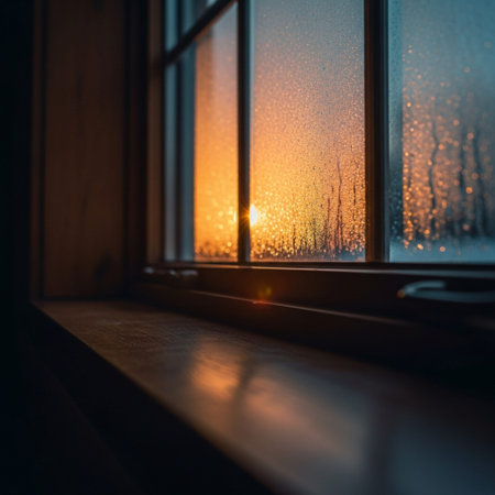 A beautiful sunset view through a window, highlighting dust particles dancing in the light. This serene scene captures a moment of tranquility and natural beauty.