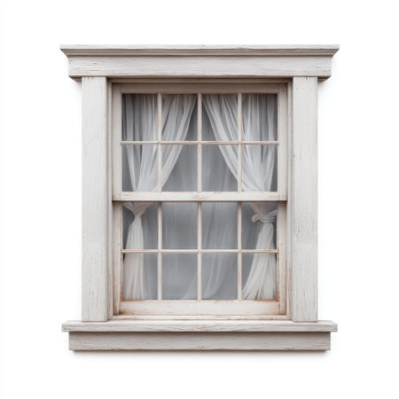 A charming vintage white window frame adorned with sheer curtains, perfect for adding rustic elegance to any interior space. Ideal for home decor inspirations.