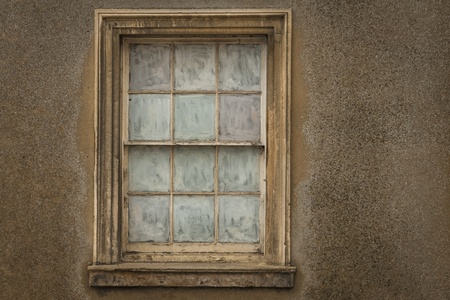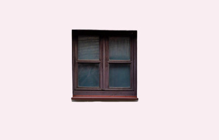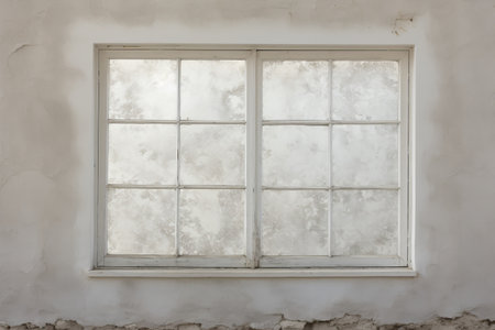 A close-up of an old window, its weathered frame and cracked glass standing out starkly against a pure white background