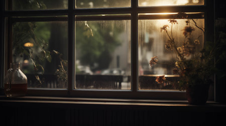 Sunlight streams through dusty window, illuminating glass panes and creating warm, inviting atmosphere. play of light and shadow adds depth to scene, evoking sense of tranquility and nostalgia