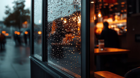 A cozy cafe scene with raindrops on window