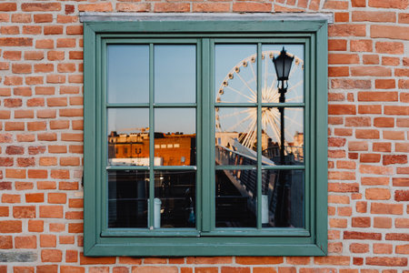 Vintage window on a brick wall with a ferris wheel in the background