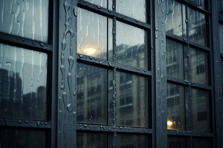 Close view of a small rusted window frame in a distressed dark gray brick facade, showing heavy rain streaks contrasted by warm interior light and cool, out-of-focus high-rise buildings in the blue...