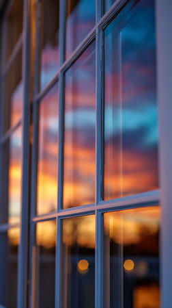 Captivating close-up of a white-framed window reflecting a stunning sunset. Hues of orange and blue blend across the glass, punctuated by blurred golden lights.