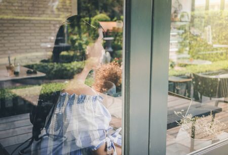 Portrait of a young African American woman looking through window
