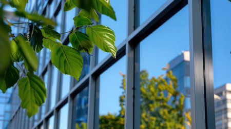 A detailed close-up of vibrant green leaves against the backdrop of a modern glass building, showcasing reflections and a clear blue sky. Perfect for nature and urban themes.