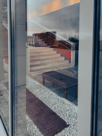 Window reflection of beautiful cloudy sky at sunset.