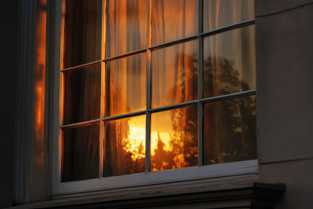 Warm orange glow of setting sun reflected on a multi paned window with curtains, creating a cozy evening atmosphere