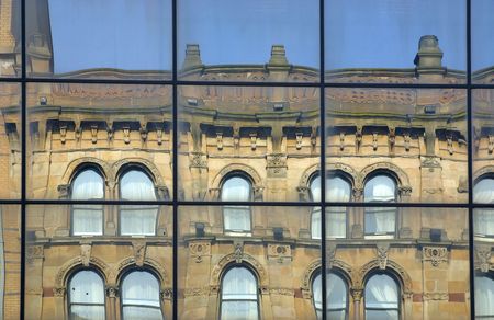Classical building reflected in the crystal windows of a modern building