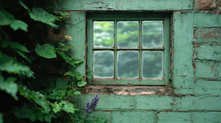 Weathered green window frame with overgrown plants