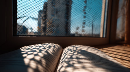 An open book rests on a windowsill, casting complex shadows while offering a view of urban life outside. Bright sunlight highlights the texture and ambiance of the scene.
