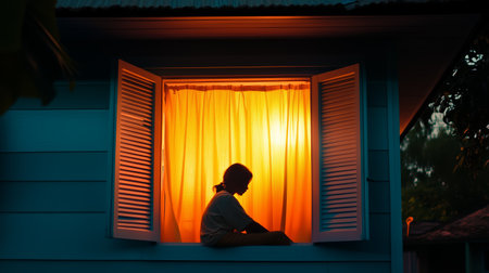 Girl sitting by an open window at dusk, illuminated by warm light through sheer curtains