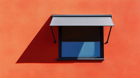 A narrow window with a sleek metal visor, casting long shadows on a bright, smooth wall during midday sun