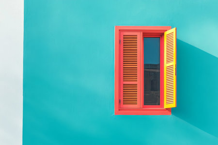 Window with open shutters on bright color wall background, AI generated