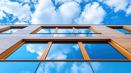 Modern building facade with wooden window frames.