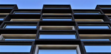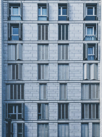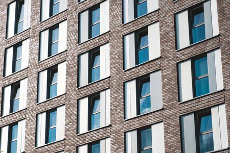 Minimalist facade of modern office building with square Windows. Frontal view of the facade of building with a lot of windows with people staying at home during quarantine.