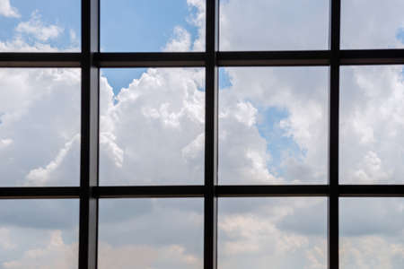 The glass window pattern on the building wall with the cloud reflection in the urban area, front view with for the background.