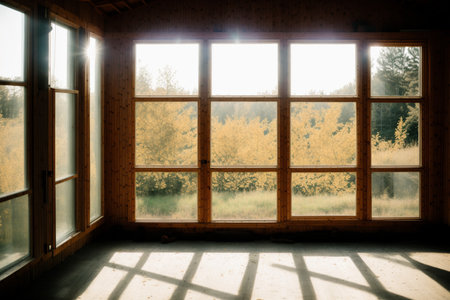 Bright and airy interior with large windows offering a stunning view of autumn trees. Soft light filters through enhancing the serene atmosphere in the space.