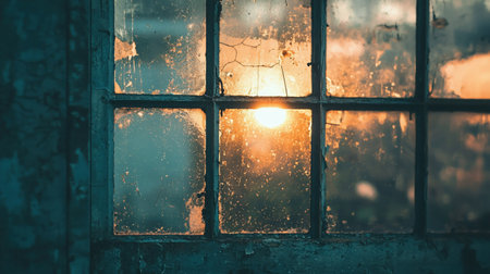 Sunlight streams through dusty window, illuminating glass panes and creating warm, inviting atmosphere. play of light and shadow adds depth to scene, evoking sense of tranquility and nostalgia