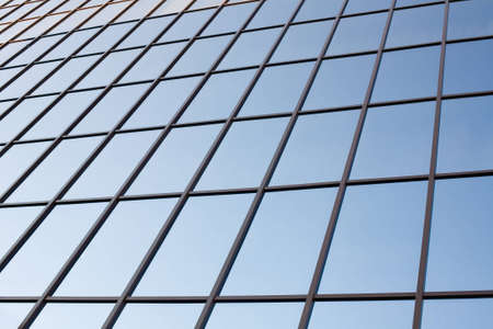 Glass window wall of modern building with blue sky reflection forming textured pattern