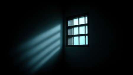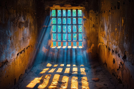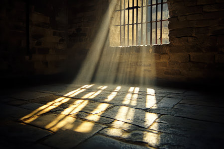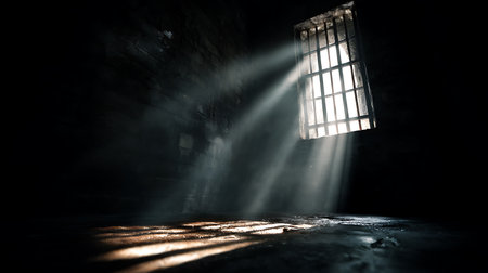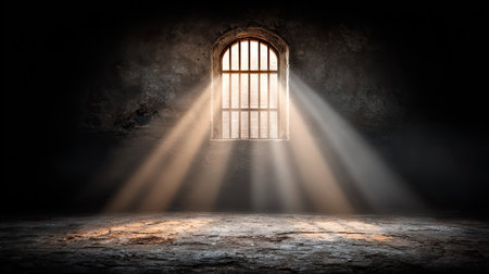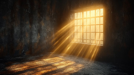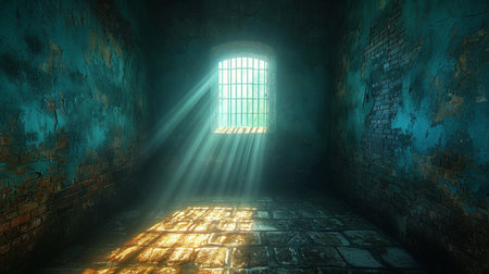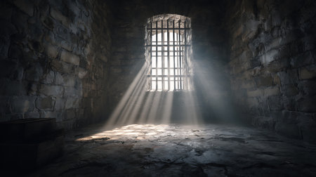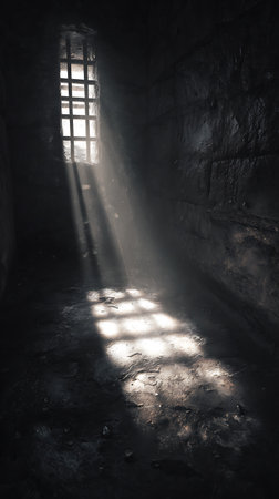 Sunlight pierces through the barred window of a prison cell, illuminating a stark, dark room. The interplay of light and shadow creates a powerful image of confinement and hope amidst desolation.
