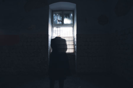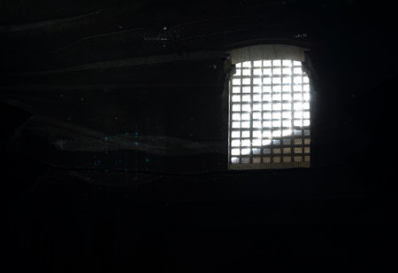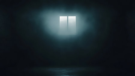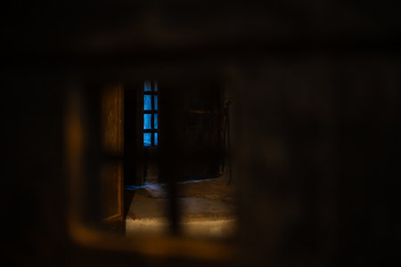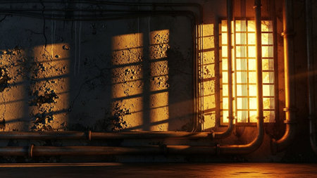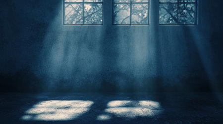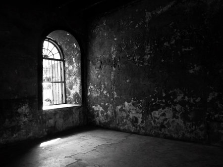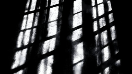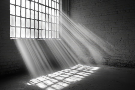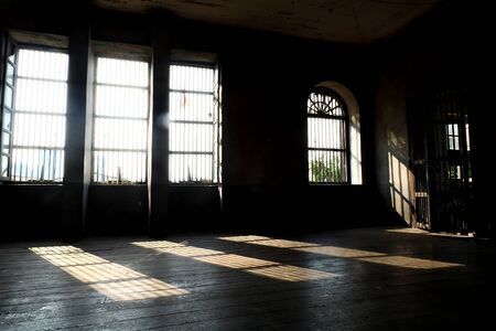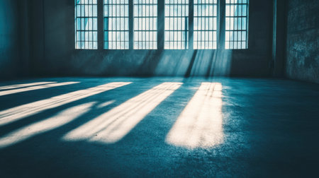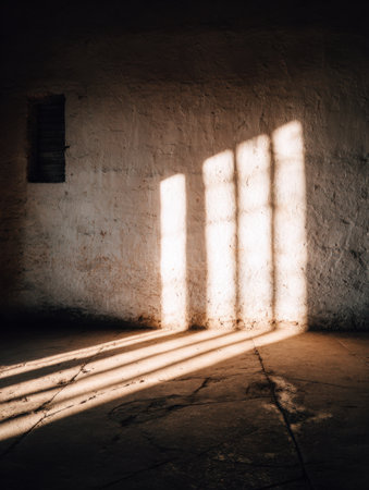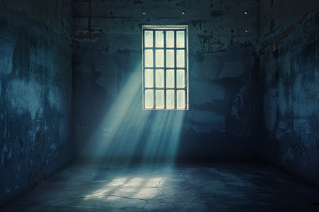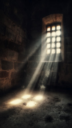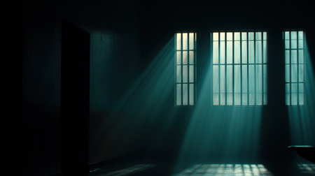 Dimly lit room with barred windows allows beams of light to filter through, creating dramatic atmosphere. shadows and light interplay evoke sense of mystery and solitude