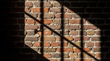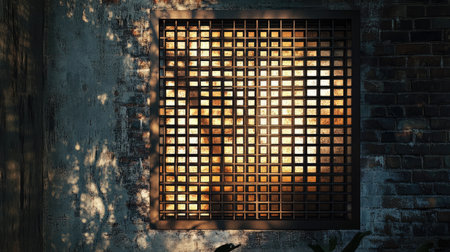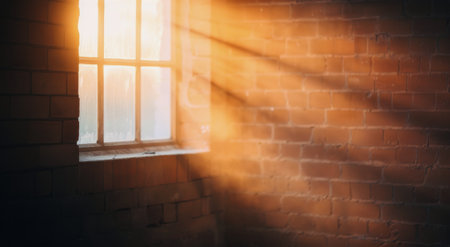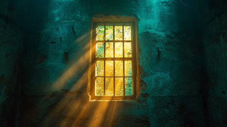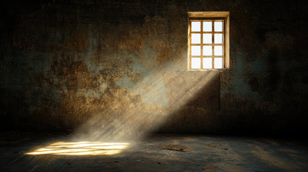 A window with strong sunlight beams brightens a dimly lit interior space. The scene features a barred window, textured walls, and a floor bathed in light. The composition evokes a sense of confinement or isolation. This image could be used for conceptual illustrations or as a backdrop for various creative projects.