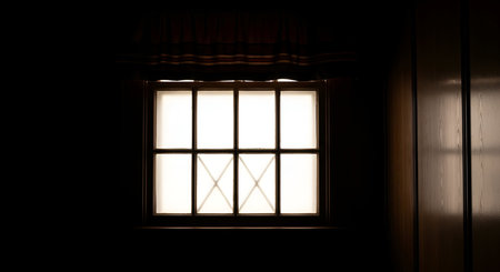 A dimly lit interior room features a central window with eight illuminated panes, divided by a wooden grid. Dark curtains hang above the window, and a textured wooden wall is visible on the right side. The contrast between the dark surroundings and the bright window creates a dramatic effect.