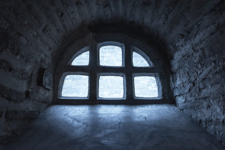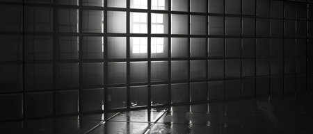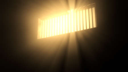 Dark prison environment portraying a window with strong metal bars, presenting a concept of confinement, oppression, and hope from the shining light filtering through the glass