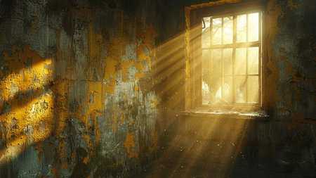 A captivating view of rays of sunlight filtering through dusty windows in an abandoned room, casting soft shadows and creating an enigmatic and tranquil atmosphere.