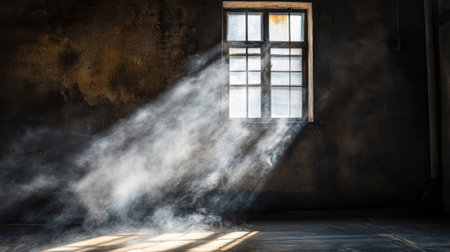 A dimly lit room features a foggy ambiance with light streaming in from a window. The contrast between darkness and light creates an eerie yet captivating atmosphere.