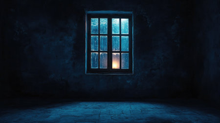 A captivating scene featuring a weathered window illuminating a dark room with warm golden light. The textured brick walls enhance the atmosphere and evoke emotions.