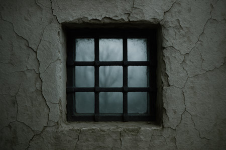 Old weathered prison window with iron bars set in cracked concrete wall on a gloomy and misty day, eerie and moody atmosphere.