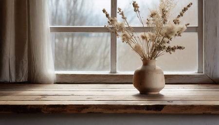 A serene window view featuring delicate dried flowers against soft natural light, capturing minimalist beauty and tranquil ambiance in a cozy indoor setting.