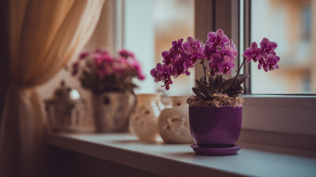 Purple orchid plant in a violet pot sits on a windowsill, with soft lighting and a shallow depth of field. Other decorative items are visible in the background.