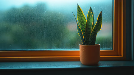 A tranquil scene featuring a vibrant plant placed on a windowsill, illuminated by soft natural light filtering through a rain-drenched window.