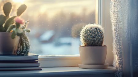 A serene indoor scene featuring a cactus on a windowsill, illuminated by soft sunlight. The cozy setting showcases nature's beauty and tranquility, perfect for decor.