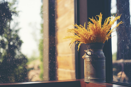 Flower pot on the window sill with rain drops on the background