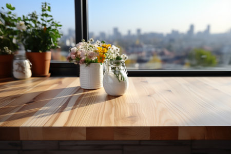 AI Generated. Wooden cutting board kitchen window sunlight display