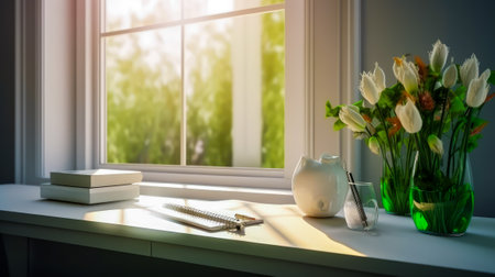 AI Generated. Morning sunlight illuminates a green cup and plant on a windowsill in a tranquil setting