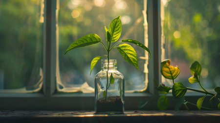Young plant growing in a glass jar by the window, illuminated by warm sunlight, creating a fresh and hopeful visual perfect for themes related to growth, nature, and home decor.