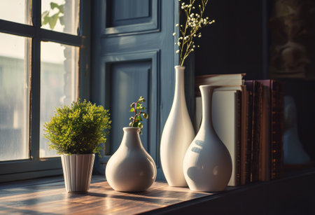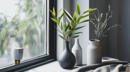 Small potted plants and modern vases grouped together on a windowsill with soft lighting