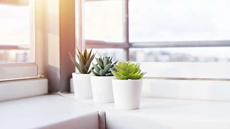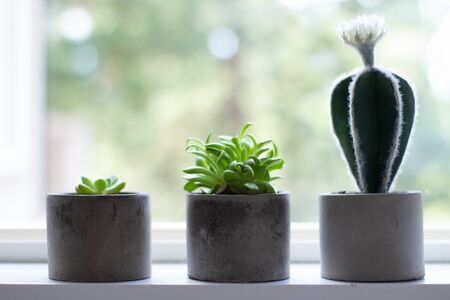 Succulents in pots on the windowsill. Mini cacti potted in white pots. Home decoration ideas.