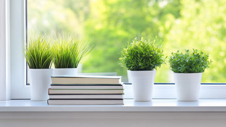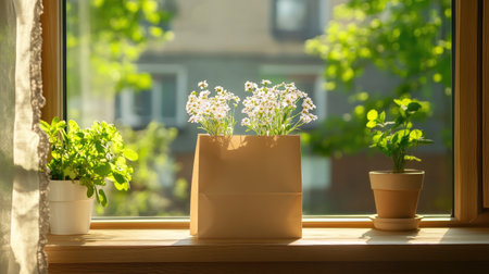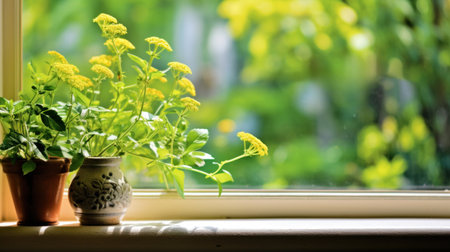 A rustic windowsill adorned with potted plants and warm sunlight streaming through, creating a cozy and natural ambiance.