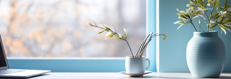 A peaceful workspace near a window, featuring a laptop, flowers in a vase and a cup, creating a serene atmosphere.