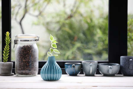 A small tree with green leaf in glass vase on window sill by window and indoor plants, decoration and interior design at living room.