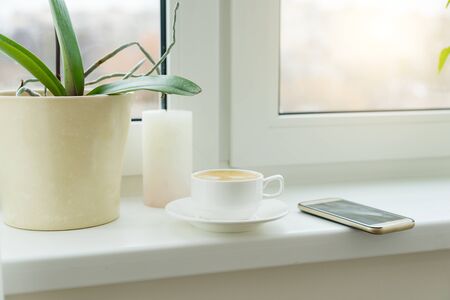 Abstract photo windowsill morning white cup with coffee mobile phone, nobody home interior.