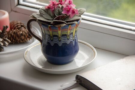 flower violet in a pot and a daily planner for planning the day on the windowsill.