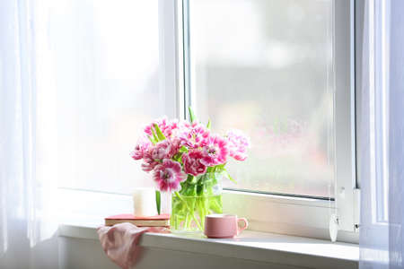 Vase with beautiful tulip flowers, cup of tea, book and candle on windowsill